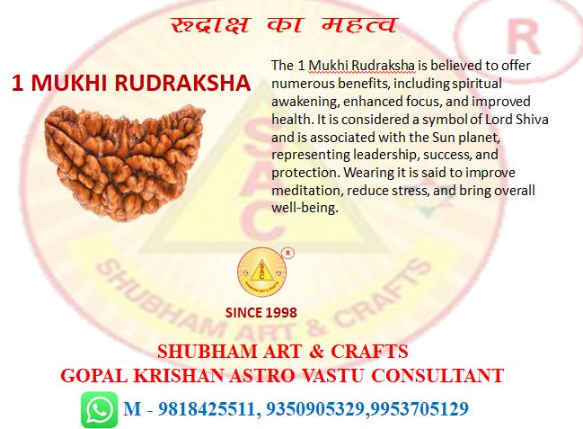 The 1 Mukhi Rudraksha is believed to offer numerous benefits, including spiritual awakening, enhanced focus, and improved health. It is considered a symbol of Lord Shiva and is associated with the Sun planet, representing leadership, success, and protection. Wearing it is said to improve meditation, reduce stress, and bring overall well-being.
