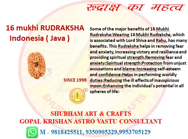 Some of the major benefits of 16 Mukhi Rudraksha:Wearing 16 Mukhi Rudraksha, which is associated with Lord Shiva and Rahu, has many benefits. This Rudraksha helps in removing fear and anxiety, increasing victory and resilience and providing spiritual strength.Removing fear and anxiety:Spiritual strength:Protection from unjust accusations and blame:Increasing self-esteem and confidence:Helps in performing worldly duties:Reducing the ill effects of inauspicious moon:Enhancing the individual’s potential in all spheres of life:
