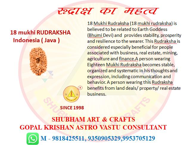 18 Mukhi Rudraksha (18 mukhi rudraksha) is believed to be related to Earth Goddess (Bhumi Devi) and provides stability, prosperity and resilience to the wearer. This Rudraksha is considered especially beneficial for people associated with business, real estate, mining, agriculture and finance.A person wearing Eighteen Mukhi Rudraksha becomes stable, organized and systematic in his thoughts and expression, including communication and behavior. A person wearing this Rudraksha benefits from land deals/ property/ real estate business.
