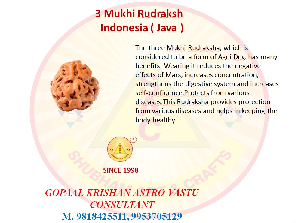 The Three Mukhi Rudraksha, which is considered to be a form of Agni Dev, has many benefits. Wearing it reduces the negative effects of Mars, increases concentration, strengthens the digestive system and increases self-confidence. Protects from various diseases: This Rudraksha provides protection from various diseases and helps in keeping the body healthy.