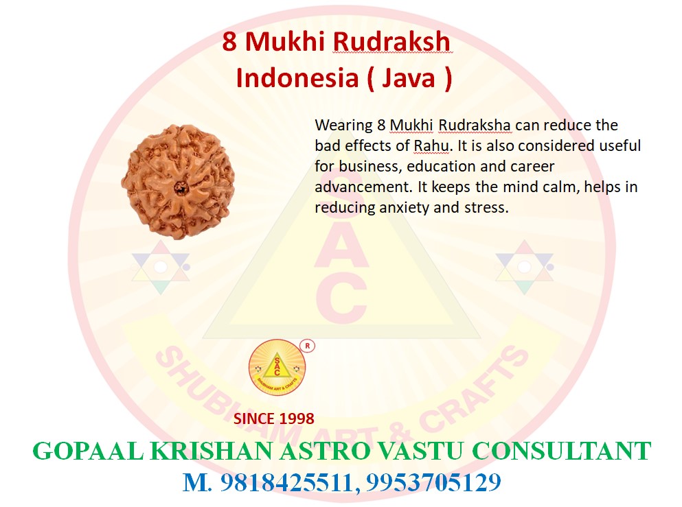 Wearing 8 Mukhi Rudraksha can reduce the bad effects of Rahu. It is also considered useful for business, education and career advancement. It keeps the mind calm, helps in reducing anxiety and stress.
