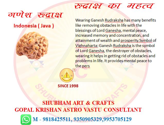 Wearing Ganesh Rudraksha has many benefits like removing obstacles in life with the blessings of Lord Ganesha, mental peace, increased memory and concentration, and attainment of wealth and prosperity.Symbol of Vighnaharta: Ganesh Rudraksha is the symbol of Lord Ganesha, the destroyer of obstacles, wearing it helps in getting rid of obstacles and problems in life. It provides mental peace to the pers