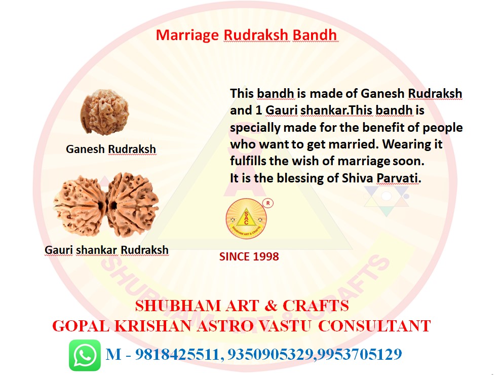 This bandh is made of Ganesh Rudraksh and 1 Gauri shankar.This bandh is specially made for the benefit of people who want to get married. Wearing it fulfills the wish of marriage soon.